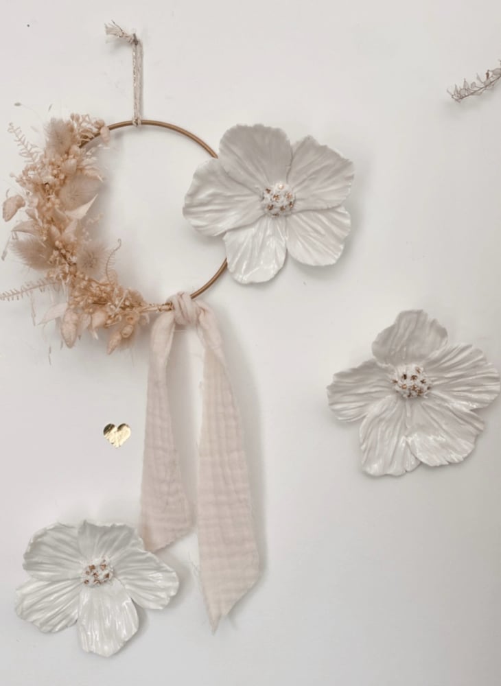 Fleur en porcelaine blanche à poser ou accrocher avec quelques touches d'or véritable qui nécessite une 3 eme cuisson .